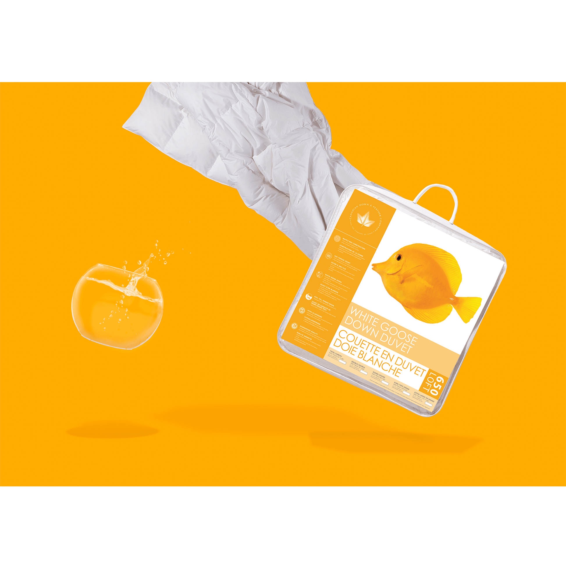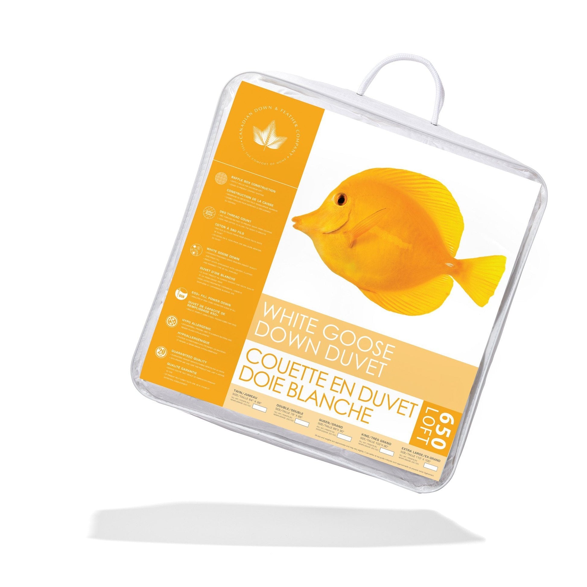 This goose down duvet is filled with care in Canada. The cotton shell is 360 thread count, so it is soft and quiet. The duvet is filled with 650 loft goose down. Down fill is soft and luxurious, made up of tiny, fluffy clusters. This duvet is fairly lightweight, but you'll find this duvet contains more fill than a duvet with 700 or 850 loft down. This is because the higher the loft of the down, the better the insulating properties, and the less of it we need to achieve the desired warmth level! Conversely, you'll find it has less fill than a duvet with 550 or 575 loft down.