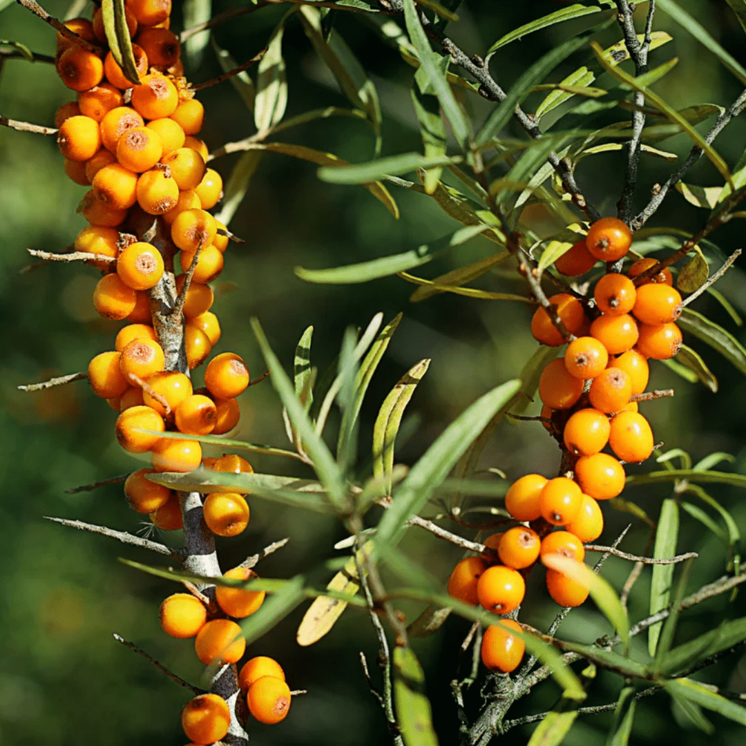 L’argousier est un arbuste produisant de jolies baies orangées reconnues pour avoir de nombreuses vertus sur la santé. Elles sont riches en vitamine A, C et E, en bêtacarotène et en fer.