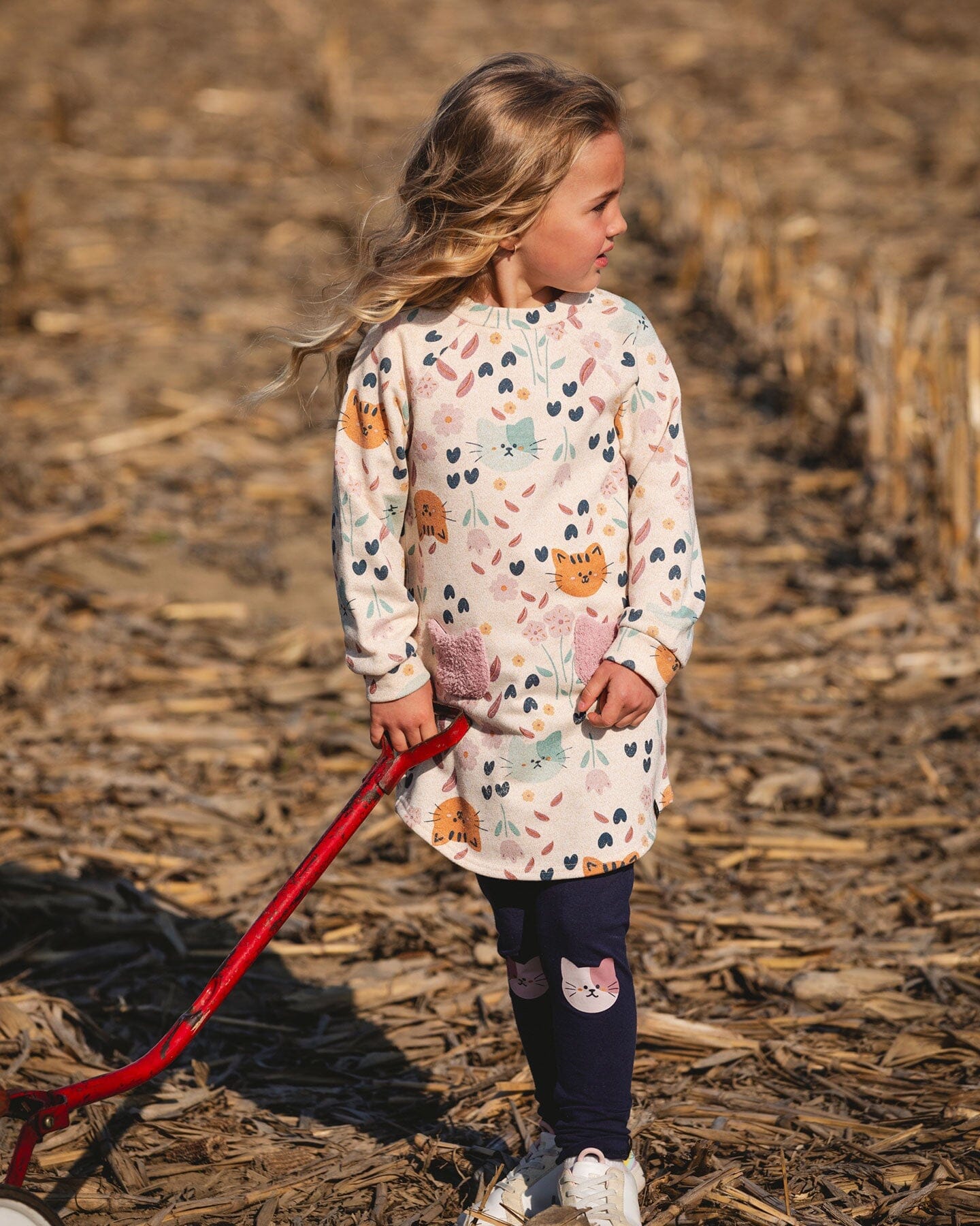 The French Terry Dress Beige Printed Cat is a cozy, playful option for your little girl. This charming piece is made from a soft french terry fabric, offering both stretch and comfort for all-day wear. The adorable allover cat and flower print adds charm, while the two cute cat-shaped pockets on the front provide extra fun and functionality. With long sleeves, a round neckline and a relaxed fit, this dress is perfect for chilly days and endless adventures.