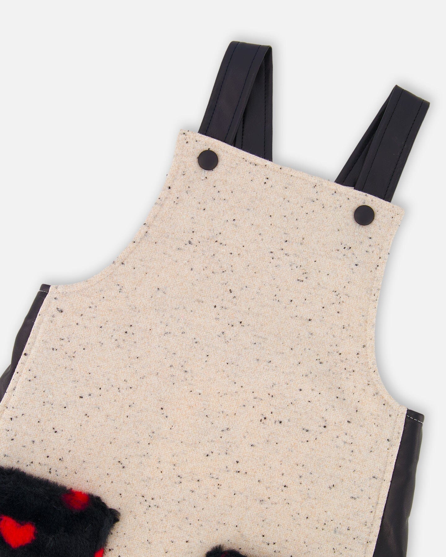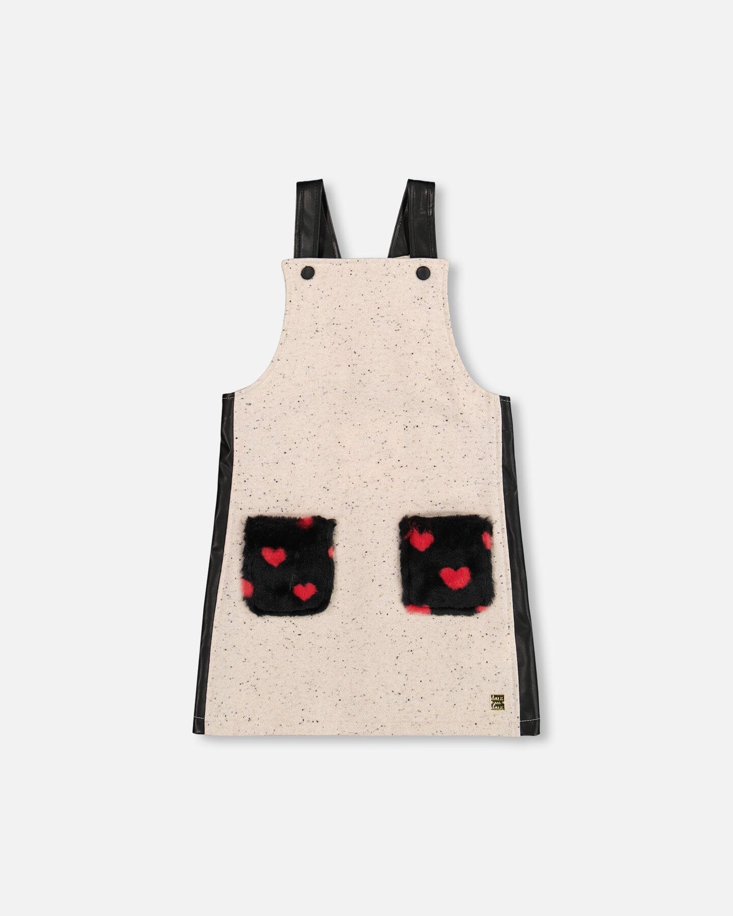 This adorable French Terry Overall Dress in Beige, Black, and Pink is the perfect blend of chic and comfort. Made from a cozy french terry with lurex, this sleeveless dress features a playful design with faux-fur pockets with a heart pattern on the front, adding an extra touch of charm. The adjustable straps and easy-to-wear fit make this overall dress ideal for layering over any top for a fun, fashionable outfit. Whether for casual outings or a day of fun play, this dress is sure to keep her cozy and stylish.