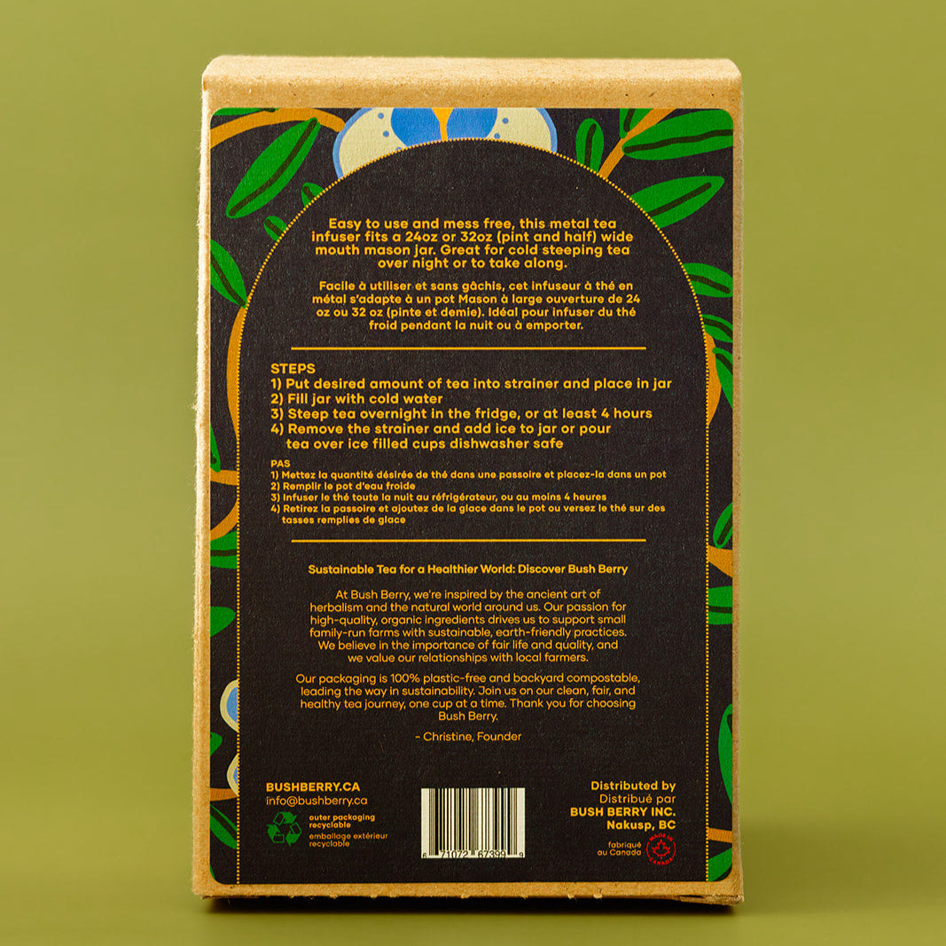 Simply add 2 tbls of your favourite loose tea per 1 L (quart jar), fill with cold water, pop on the lid, and steep in the fridge overnight, or for a minimum of 4 hours. The fine mesh keeps leaves contained while letting all the vibrant flavours shine through.