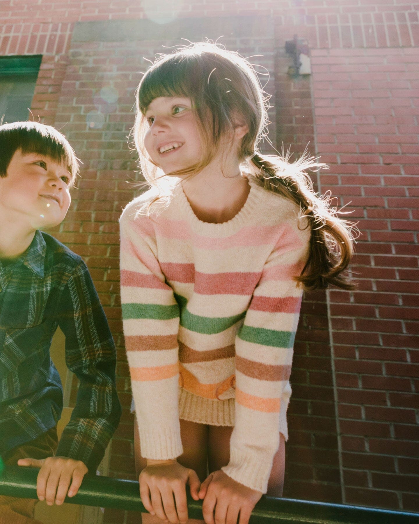 This Knitted Tunic Off-White With Stripes is like a warm hug wrapped in style! Crafted from a soft blend of recycled polyester, wool, and elastane, this knitted top offers a perfect balance of warmth, stretch, and softness for all-day comfort. The long sleeves and ribbed trims combined with a classic off-white color, multicolored stripes and two flowers on the front bring a cozy, chic look, while the relaxed fit makes it ideal for effortless styling. Pair it with leggings or skirts for a laid-back yet stylish outfit.