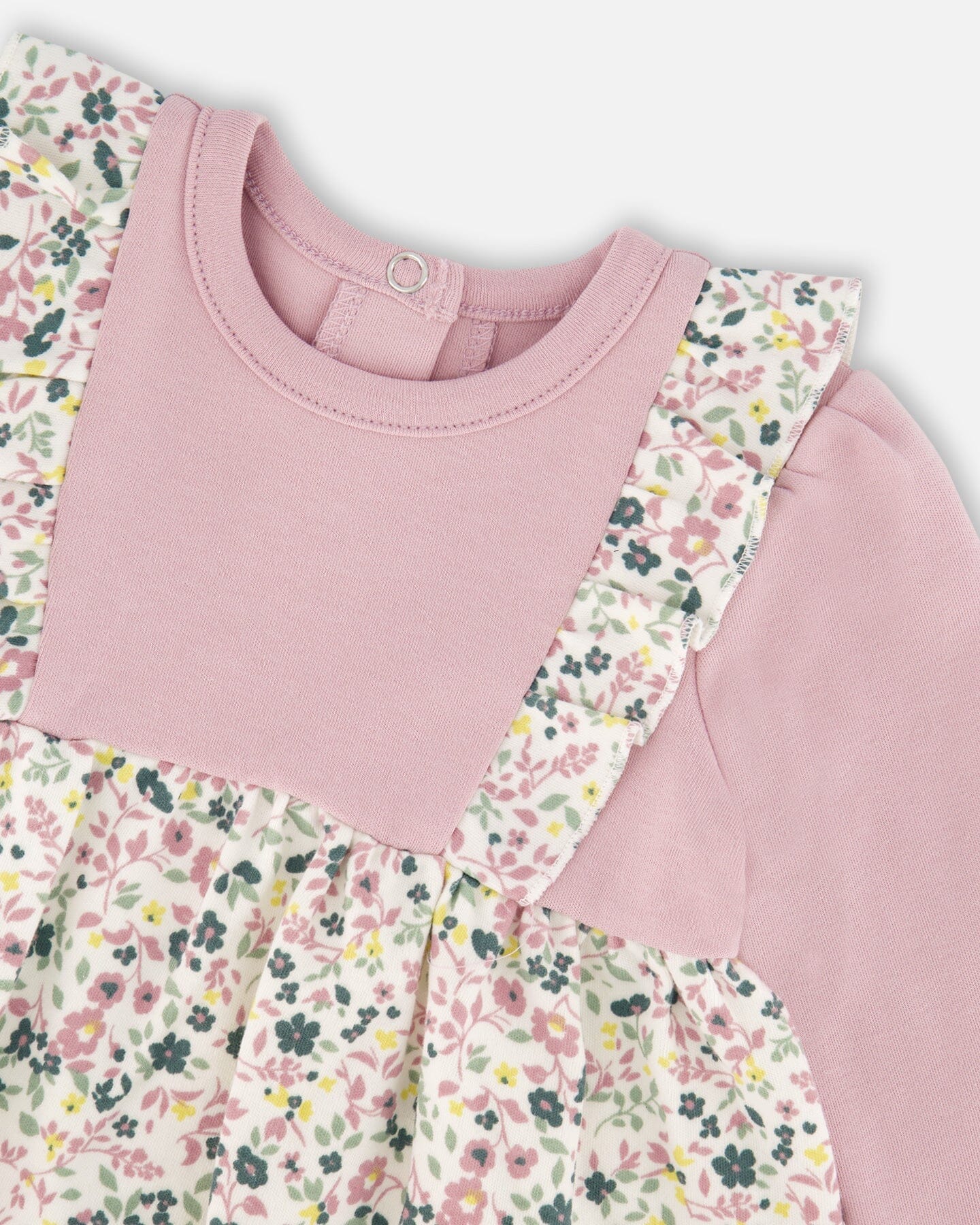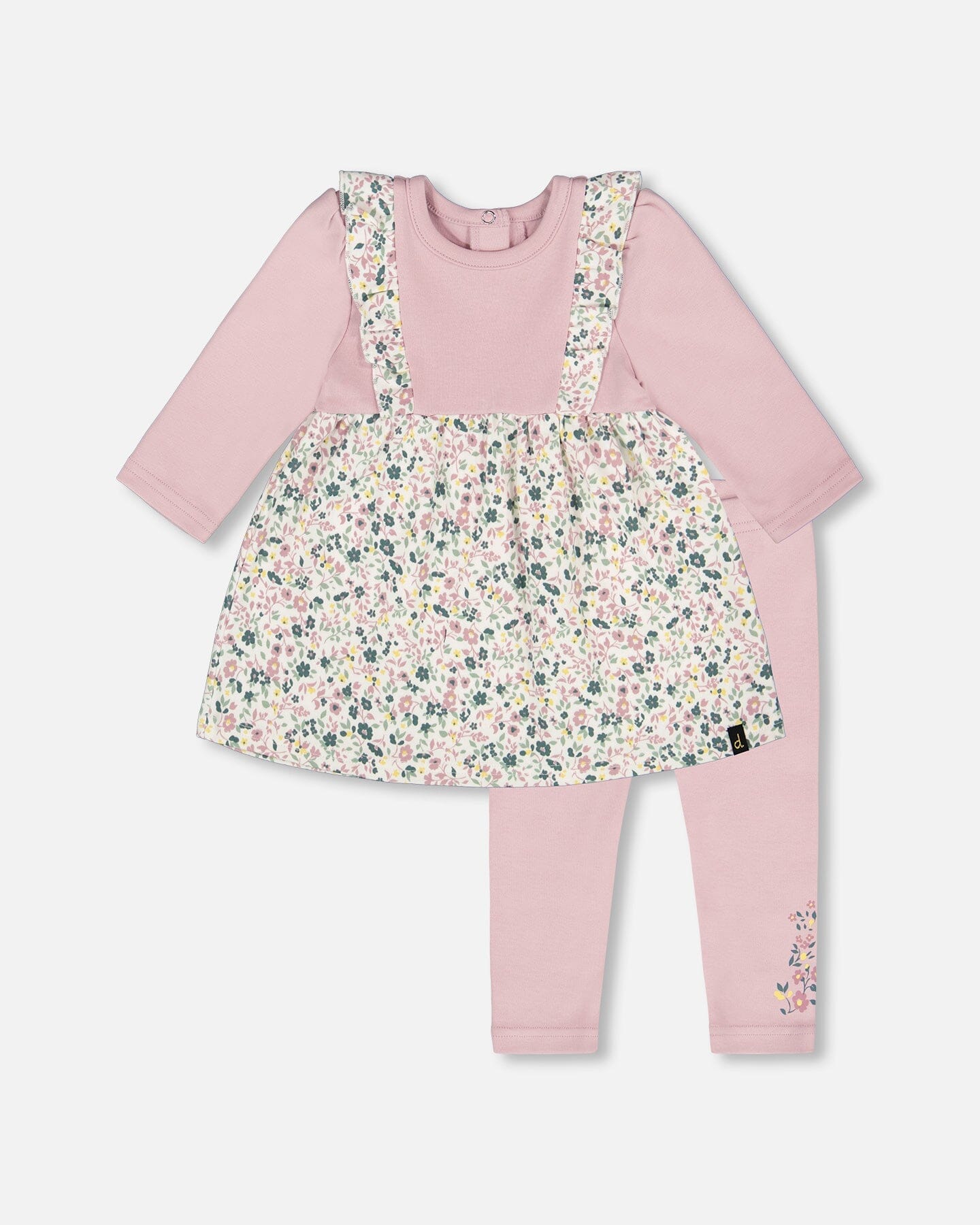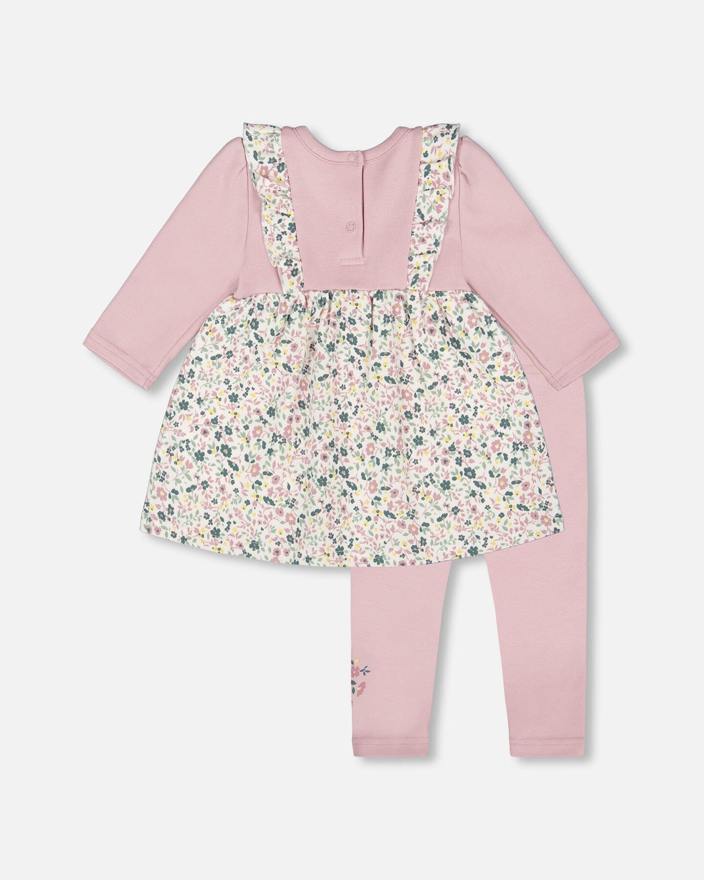 A charming blend of textures, our Organic Cotton Bi-Material Tunic and Leggings Set Neutral Purple is as stylish as it is comfy. The soft dress tunic features delicate ruffles at the shoulders and a skirt with an allover floral print and a flowing A-line cut, creating a graceful silhouette. Paired with stretchy interlock leggings, accented with a floral detail at the bottom of the left leg, this cozy outfit is perfect for playdates, strolls, and everyday adventures.