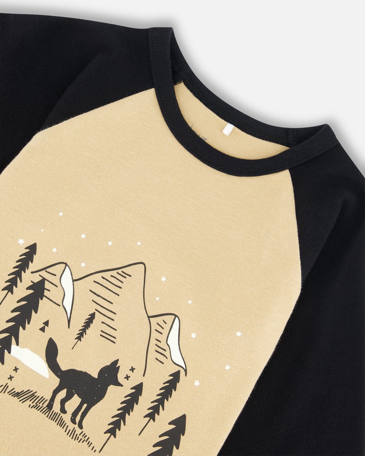 He'll be oh-so-cute and comfy when he's snuggled up in our Organic Cotton Two Piece Pajama Set Black Printed Fox. This adorable two-piece set features a long raglan sleeve top with a round neckline and a large graphic print with a fox, trees, and mountains. We've teamed it with a soft and stretchy elastic waist pant with a bold allover fox face print and solid cuffs.