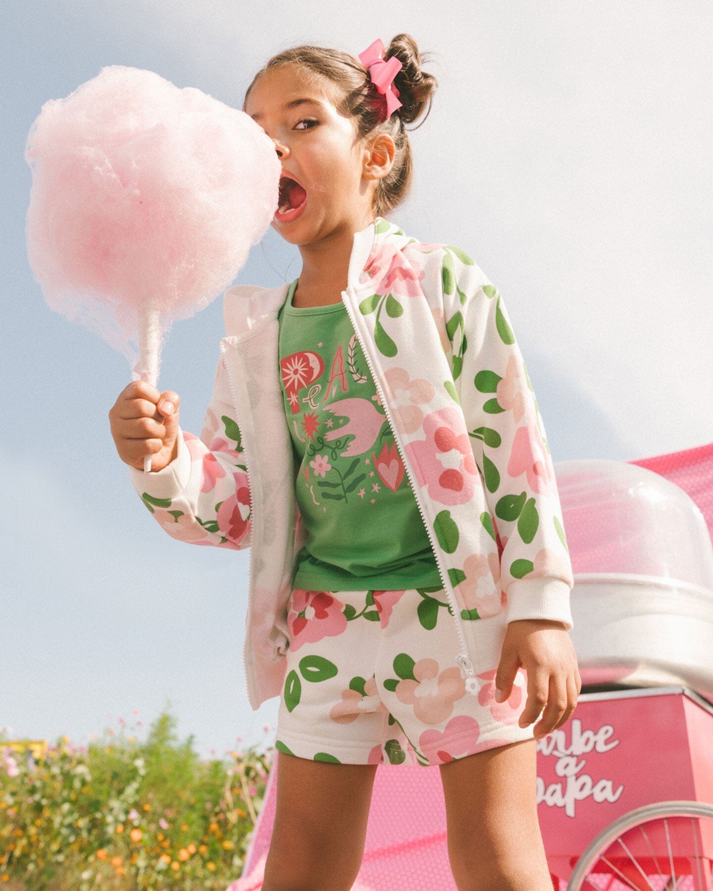 Our Printed French Terry Short Pink Flowers on White Background is perfect for the girly girl with a bold sense of style! Featuring a colorful allover flower and leaf print, this sweatshort features an easy pull-on fit with a stretch elastic waistband, slant front pockets, and a small metal logo plate at the hem.