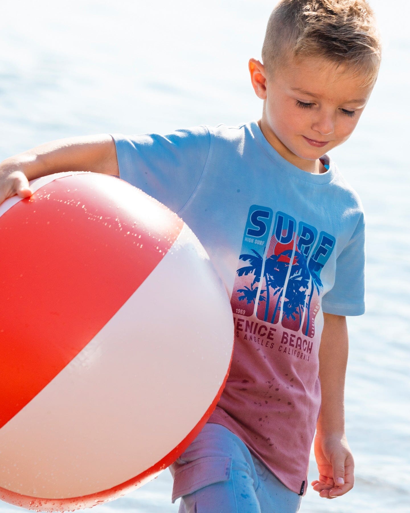 Add a touch of California style to his wardrobe with our Short Sleeve Organic Cotton Graphic Tee Gradient Pale Blue and Dark Old Rose. This tee features short sleeves, a crew neckline, and a bold Venice Beach palm tree print. Team it with any bottom in our Malibu Sands collection for a playful head to toe look!