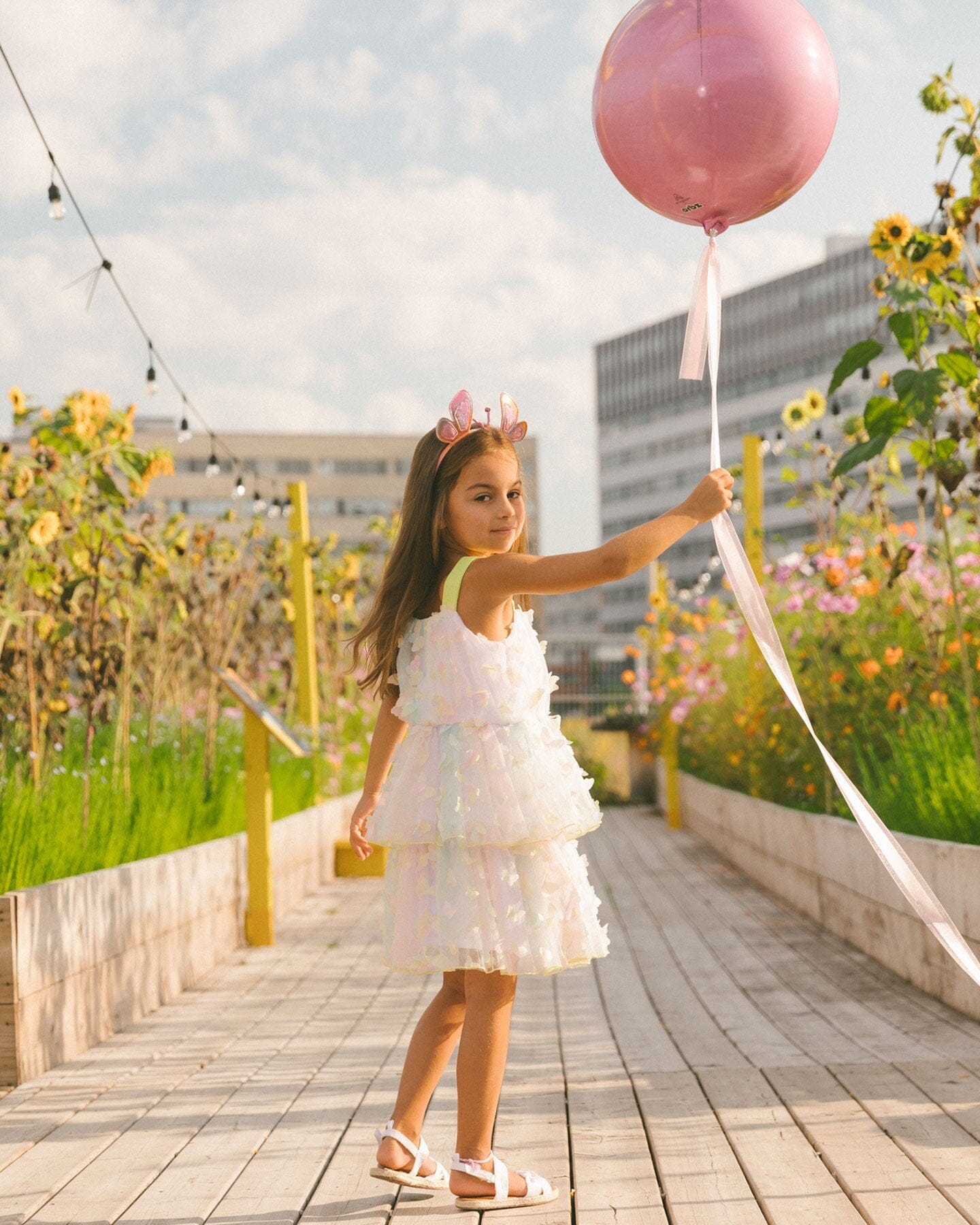 Make her next special occasion a truly memorable one with our Tiered Printed Mesh Dress Multicolored with Butterflies. Bursting with color and texture, this gradient pastel dress features a sleeveless bodice with wide straps, a square neckline, and a tiered A-line skirt adorned with three dimensional butterfly appliques.