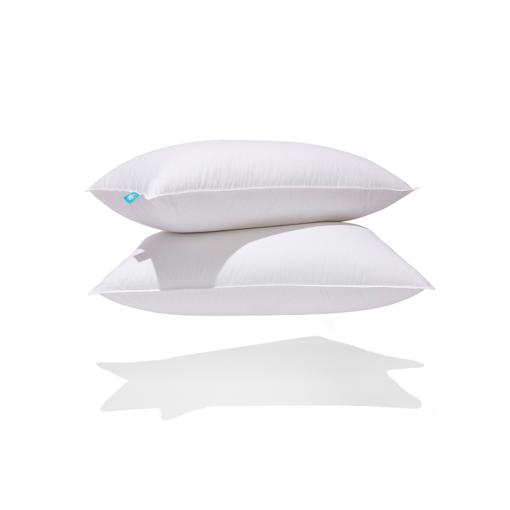 This goose down pillow is filled with care in Canada. The shell is crisp 260 thread count cotton. The fill is 575 loft goose down. Down is made up of tiny, fluffy clusters, so down pillows are very soft, sinky, and squishy.